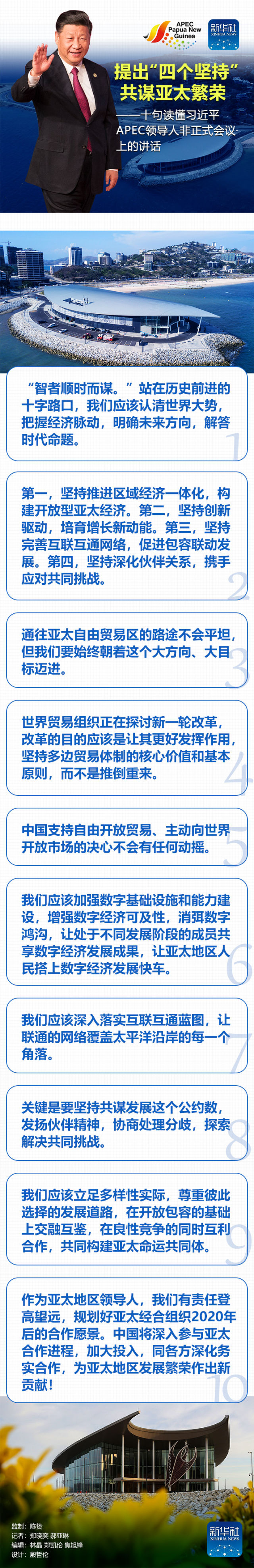 很高興同大家相聚在美麗的莫爾茲比港。亞太經(jīng)合組織成員領(lǐng)導(dǎo)人首次在太平洋島國地區(qū)聚首,圍繞“把握包容性機(jī)遇,擁抱數(shù)字化未來”的主題,回顧合作歷程,共商亞太愿景。我謹(jǐn)對巴布亞新幾內(nèi)亞政府特別是奧尼爾總理為籌備本次會議付出的努力,表示衷心的感謝!