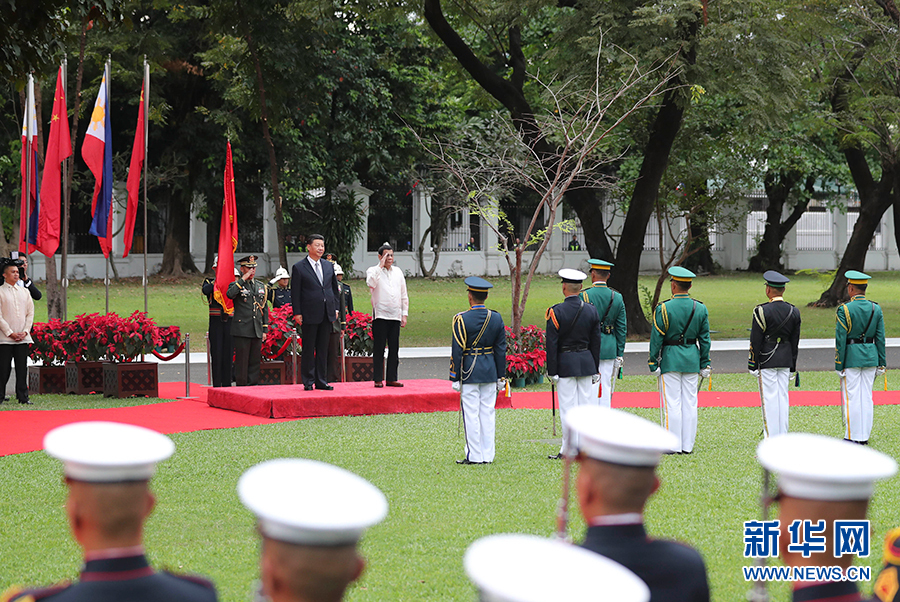 會談開始前,習(xí)近平出席杜特爾特在總統(tǒng)府前草坪舉行的隆重歡迎儀式。