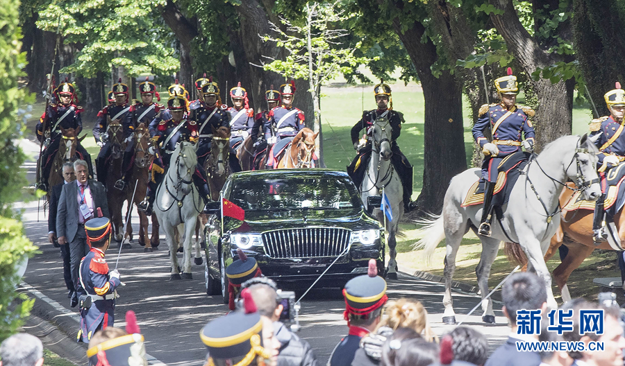 習(xí)近平和夫人彭麗媛在馬隊(duì)護(hù)衛(wèi)下前往總統(tǒng)官邸,禮兵在林蔭大道兩側(cè)列隊(duì)接受檢閱。抵達(dá)榮譽(yù)廣場時,軍樂團(tuán)奏響歡快的進(jìn)行曲。馬克里和夫人阿瓦達(dá)上前熱情迎接。兩國元首夫婦登上檢閱臺。軍樂團(tuán)奏中國、阿根廷兩國國歌。