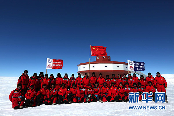 12月26日,中國第35次南極科學(xué)考察隊內(nèi)陸隊(泰山隊和昆侖隊)隊員在泰山站主體建筑前升國旗合影。 新華社記者 劉詩平 攝