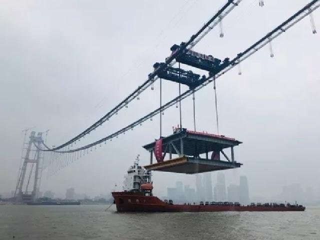 中國中鐵大橋局在湖北武漢架設(shè)楊泗港長江大橋首節(jié)段鋼梁(2018年11月15日攝)。新華社發(fā)