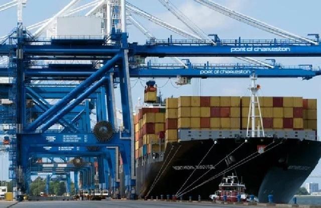 這是在美國南卡羅來納州查爾斯頓港口拍攝的集裝箱碼頭和貨輪(資料照片)。