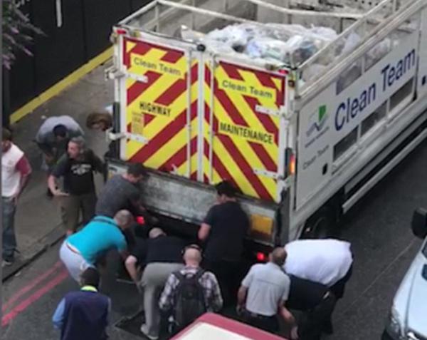 7月26日,在英國倫敦,老人被困垃圾車下。15名熱心民眾合力抬起垃圾車,幫助老人脫險。