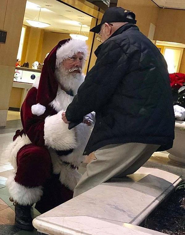 12月9日,美國特拉華州,一位裝扮成“圣誕老人”的男子向一位路過的二戰(zhàn)老兵屈膝致敬。