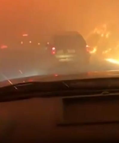 美國加州煙霧鎖城,路兩側(cè)火光沖天