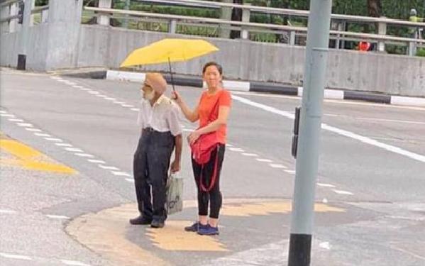 12月8日,新加坡的一個交通路口,傾盆大雨中,一名中國女性為一名印度錫克教徒打扮的老者撐傘。