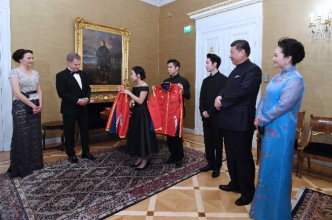 2017年4月訪問(wèn)芬蘭期間,習(xí)近平主席同尼尼斯托總統(tǒng)共同會(huì)見(jiàn)剛剛參加完2017年世界花樣滑冰錦標(biāo)賽的中芬兩國(guó)冰雪運(yùn)動(dòng)員代表。