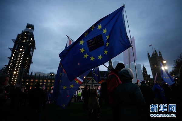 這是1月15日在英國倫敦議會(huì)大廈外拍攝的示威者揮舞的英國和歐盟旗幟。 新華社發(fā)(蒂姆·愛爾蘭攝)