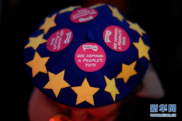1月15日,在英國倫敦,一名戴著帽子的反對(duì)英國“脫歐”示威者在議會(huì)大廈外參加集會(huì)。 新華社發(fā)(蒂姆·愛爾蘭攝)
