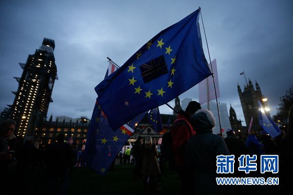1月15日,在英國倫敦,反對英國“脫歐”示威者在議會大廈外參加集會。新華社發(fā)(蒂姆·愛爾蘭攝)