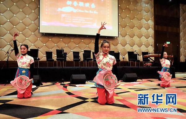 1月30日,在科威特的費(fèi)爾瓦尼耶省,來自南京藝術(shù)團(tuán)的演員在中國駐科威特使館新春招待會上表演民族舞蹈。新華社發(fā)(約瑟夫 攝)
