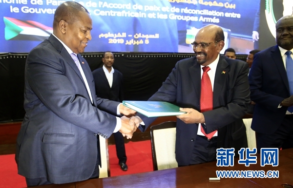 新華社喀土穆2月5日電(記者馬意翀)中非共和國沖突多方代表5日在蘇丹首都喀土穆簽署和平協議。蘇丹總統(tǒng)巴希爾和中非共和國總統(tǒng)圖瓦德拉共同出席了簽署儀式。