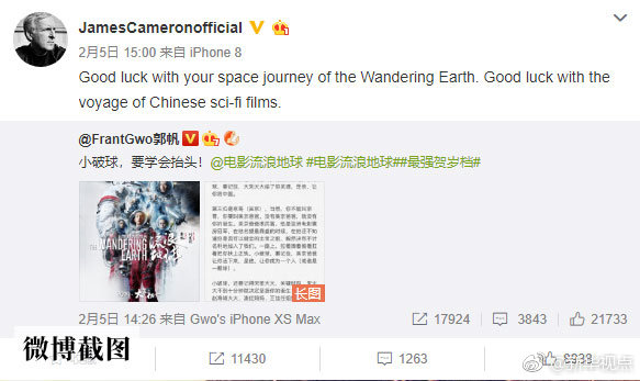 正如好萊塢大導(dǎo)演詹姆斯·卡梅隆在社交媒體上對(duì)《流浪地球》發(fā)出的祝愿:“祝中國(guó)科幻電影之旅好運(yùn)!”