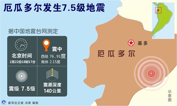 新華社基多2月22日電(記者郝云甫)厄瓜多爾中南部地區(qū)22日發(fā)生7.5級(jí)地震,首都基多、第一大城市瓜亞基爾及多個(gè)省份均有震感。目前尚無人員傷亡和財(cái)產(chǎn)損失報(bào)告。