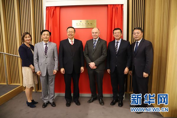 2月26日,在愛爾蘭首都都柏林,中國教育部副部長(zhǎng)田學(xué)軍(左三)、中國駐愛爾蘭大使岳曉勇(左二)和都柏林大學(xué)校長(zhǎng)安德魯?迪克斯(右三)等在都柏林大學(xué)示范孔子學(xué)院揭牌儀式上合影。