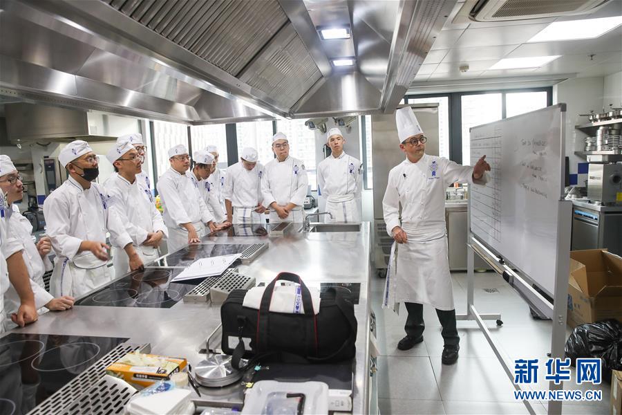 這是2018年10月17日, 來自法國的菲利普(右)在上海藍帶廚藝職業(yè)技能培訓(xùn)學(xué)校的教室內(nèi)給學(xué)員們教授法式廚藝。 新華社記者 丁汀 攝