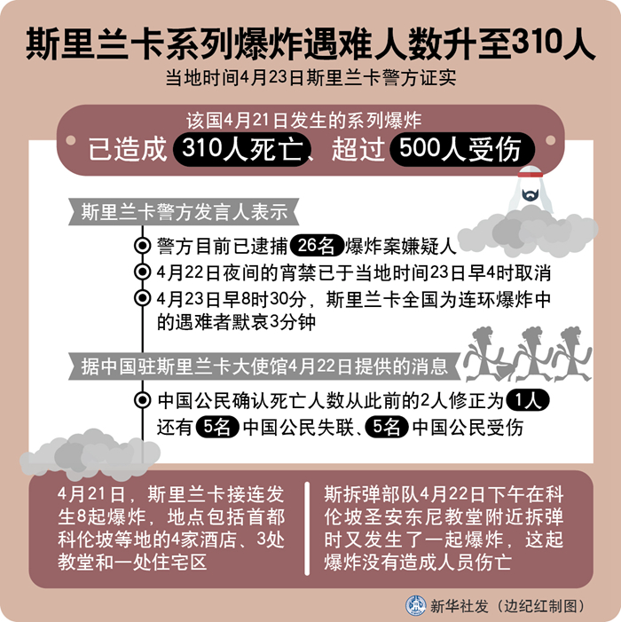 新華社科倫坡4月23日電(記者朱瑞卿 唐璐)斯里蘭卡警方23日證實,該國21日發(fā)生的系列爆炸已造成310人死亡、超過500人受傷。