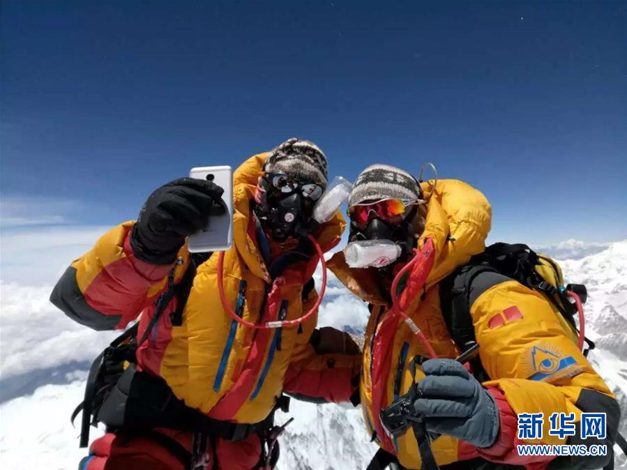 珠穆朗瑪峰頂,王銀龍向關(guān)嫻求婚(2018年5月16日攝)。新華社發(fā)