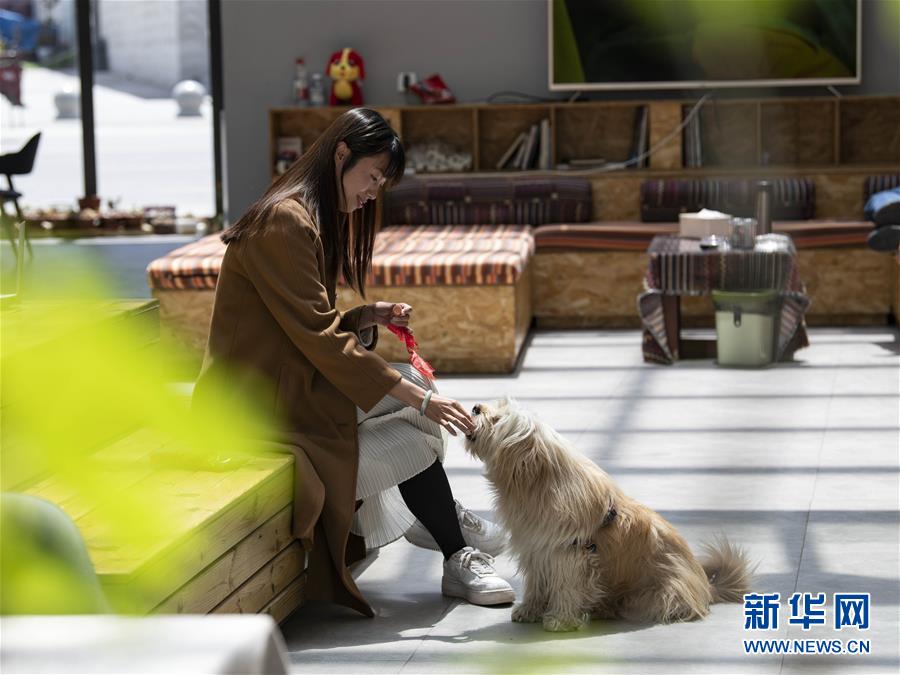 關(guān)嫻在拉薩自己開的客棧里與寵物互動(4月10日攝)。新華社發(fā)(孫非 攝)