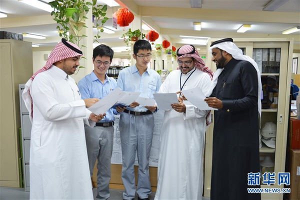 3月20日,在沙特阿拉伯的延布三期項(xiàng)目辦公室內(nèi),沙特青年艾哈邁德·薩赫利(右二)與中外員工探討工作。新華社發(fā)