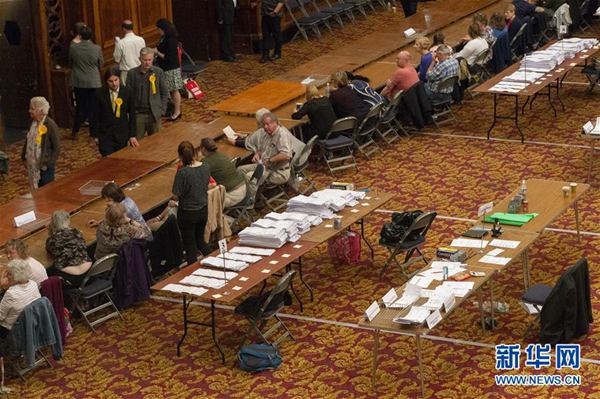 5月26日,在英國南安普敦的一個計票站,工作人員進行計票。新華社發(fā)(雷伊·唐 攝)