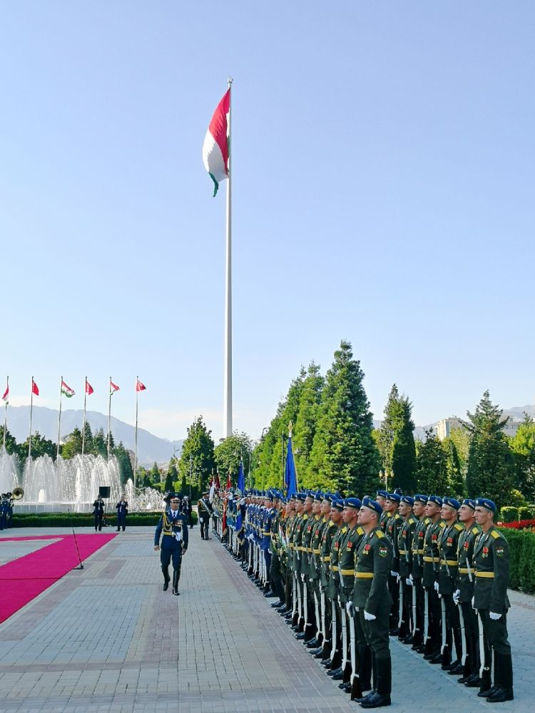 儀仗隊在塔吉克斯坦總統(tǒng)府列隊,等候兩國元首檢閱。遠(yuǎn)處高聳的旗桿位于總統(tǒng)府外的國旗公園,高165米,是杜尚別的地標(biāo)建筑之一。新華社記者 霍小光 攝