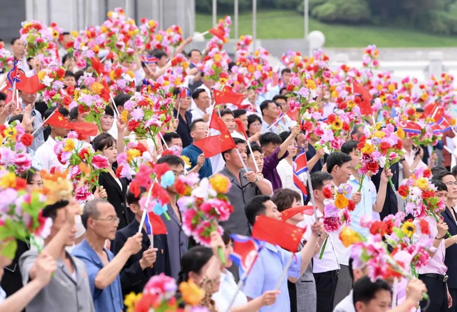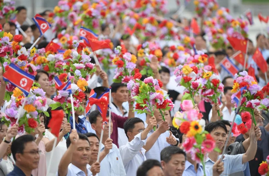 到處都是熱情的笑臉,友好的歡呼聲不絕于耳。習近平和金正恩向歡迎的人群頻頻揮手致意。