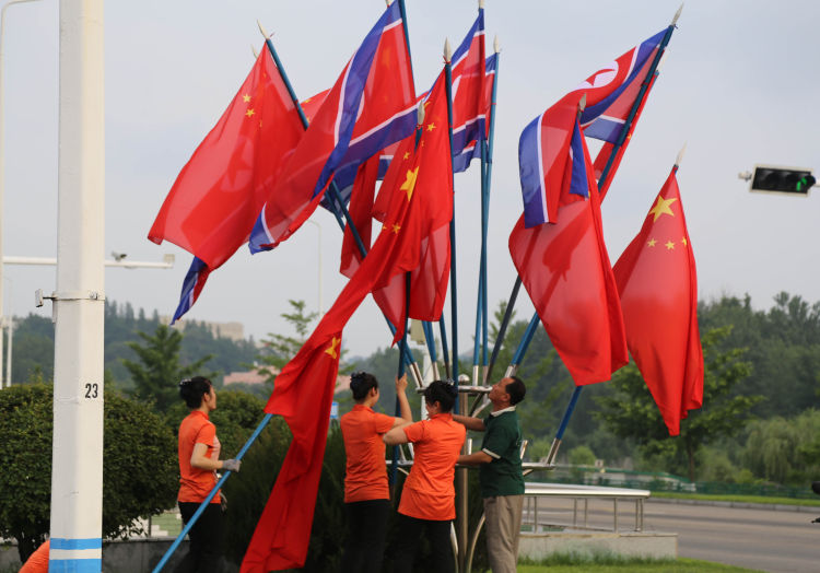 6月19日,當?shù)毓ぷ魅藛T在平壤市區(qū)街邊安裝朝中兩國國旗。新華社記者江亞平攝