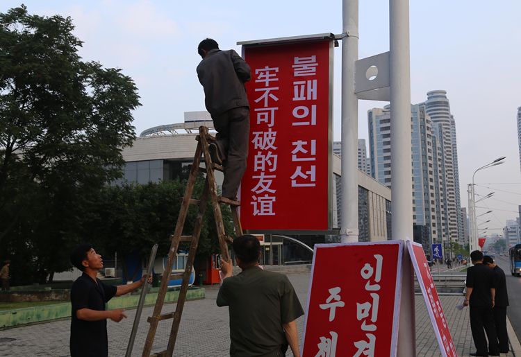 6月19日,工作人員在平壤街頭懸掛使用中朝雙語書寫的“牢不可破的友誼”標語牌。新華社記者江亞平攝