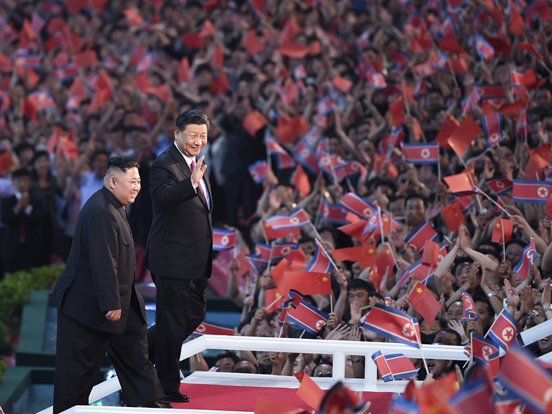 演出在以“朝中友誼萬古長青”為主題的大型歌舞表演中結(jié)束。習(xí)近平和金正恩同全場觀眾一起站立,為藝術(shù)家和演員們的精湛表演送上經(jīng)久不息的掌聲。