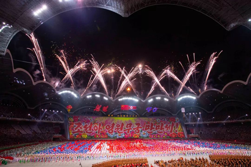2018年9月,朝鮮為慶祝建國70周年打造了名為《輝煌的祖國》的大型團(tuán)體操和藝術(shù)演出,反映朝鮮建國以來在各領(lǐng)域取得的成就。
