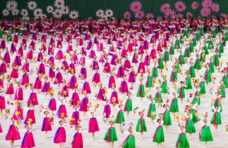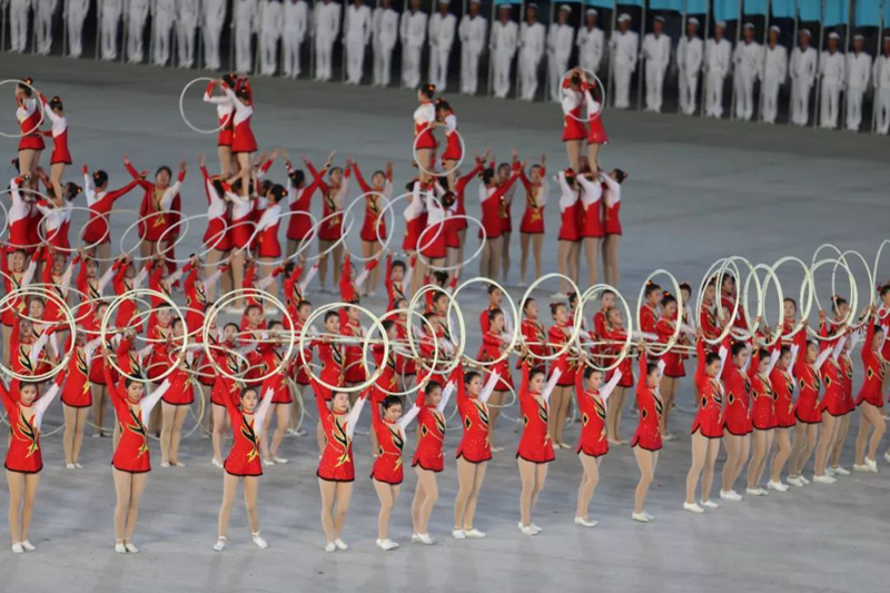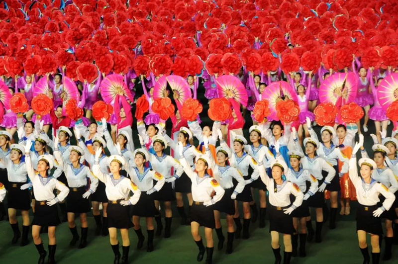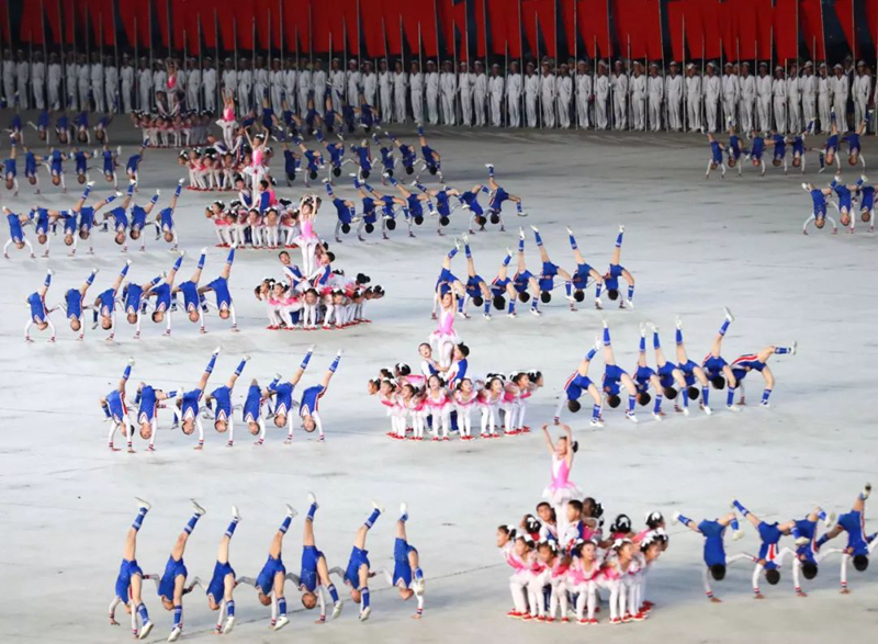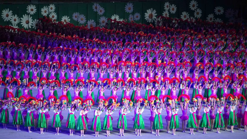 平壤大同江畔,綾羅島“五一”體育場是團(tuán)體操的主要舞臺(tái)。演出以朝鮮民族獨(dú)特的“歌舞之美”、富有活力的團(tuán)體操、嘆為觀止的雜技表演,展現(xiàn)出朝鮮革命與戰(zhàn)爭、政治和軍隊(duì)建設(shè)、民生與經(jīng)濟(jì)發(fā)展以及對(duì)外交往的宏偉畫卷。