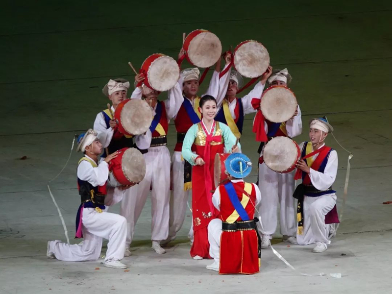 演出極具朝鮮民族特色,以“社會(huì)主義我們家園”、“勝利的回聲”、“為了更好的明天”、“牢不可破的友誼”四個(gè)章節(jié),歌頌朝鮮社會(huì)主義事業(yè)的發(fā)展成就,表達(dá)朝鮮人民對(duì)美好生活的向往,對(duì)傳承發(fā)展中朝友誼的熱切愿望,以及對(duì)習(xí)近平此次訪問的熱烈歡迎。