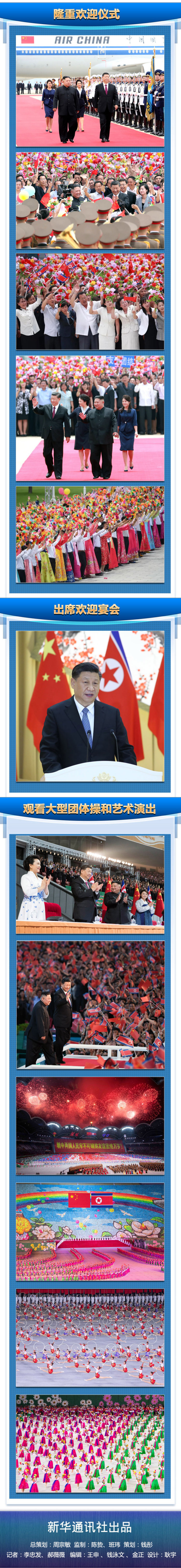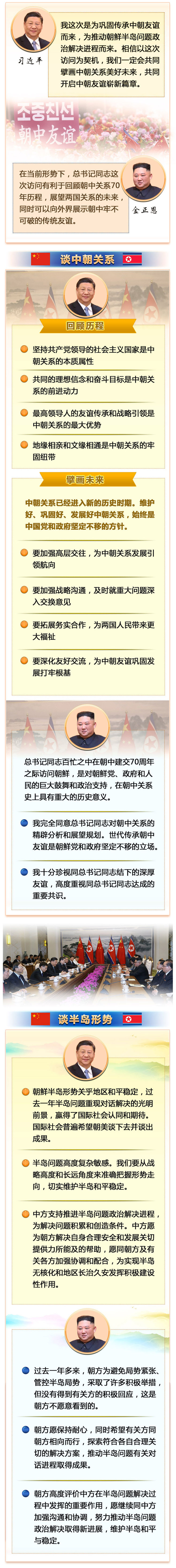習(xí)近平指出,去年以來,我和委員長同志4次會晤,書寫了中朝關(guān)系新篇章,并結(jié)下了深厚友誼。感謝金正恩委員長同志為我這次訪問舉行的隆重而熱烈的歡迎儀式,我今天從下飛機到抵達(dá)住處,所到之處無不感受到中朝一家親的濃厚氛圍。今年是中朝建交70周年,在兩黨兩國關(guān)系發(fā)展史上具有承前啟后、繼往開來的重要意義,我又同金正恩委員長在平壤會面。我這次是為鞏固傳承中朝友誼而來,為推動朝鮮半島問題政治解決進(jìn)程而來。相信以這次訪問為契機,我們一定會共同擘畫中朝關(guān)系美好未來,共同開啟中朝友誼嶄新篇章。