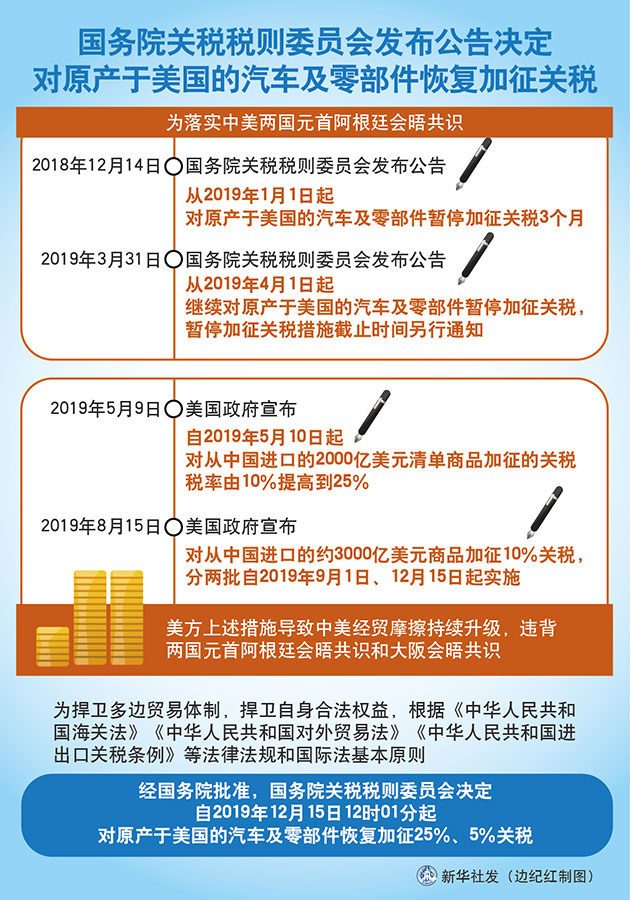 為捍衛(wèi)多邊貿(mào)易體制,捍衛(wèi)自身合法權(quán)益,根據(jù)《中華人民共和國海關(guān)法》《中華人民共和國對外貿(mào)易法》《中華人民共和國進出口關(guān)稅條例》等法律法規(guī)和國際法基本原則,經(jīng)國務(wù)院批準(zhǔn),國務(wù)院關(guān)稅稅則委員會決定,自2019年12月15日12時01分起,對原產(chǎn)于美國的汽車及零部件恢復(fù)加征25%、5%關(guān)稅。