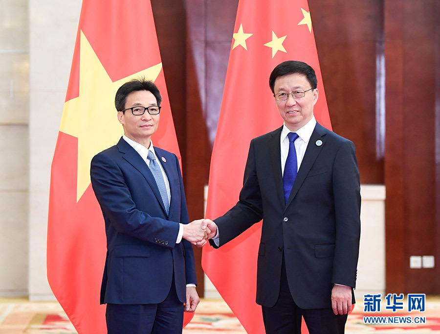 9月20日,中共中央政治局常委、國務(wù)院副總理韓正在廣西南寧會見出席第十六屆中國—東盟博覽會和中國—東盟商務(wù)與投資峰會的越南副總理武德?lián)?新華社記者 申宏 攝