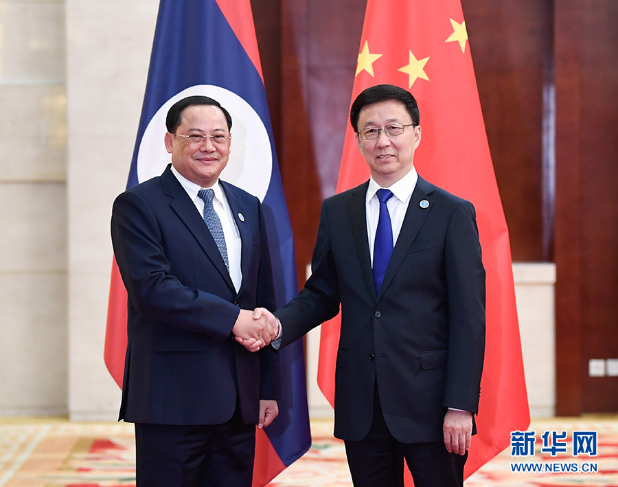 9月20日,中共中央政治局常委、國務(wù)院副總理韓正在廣西南寧會見出席第十六屆中國—東盟博覽會和中國—東盟商務(wù)與投資峰會的老撾副總理宋賽。 新華社記者 申宏 攝