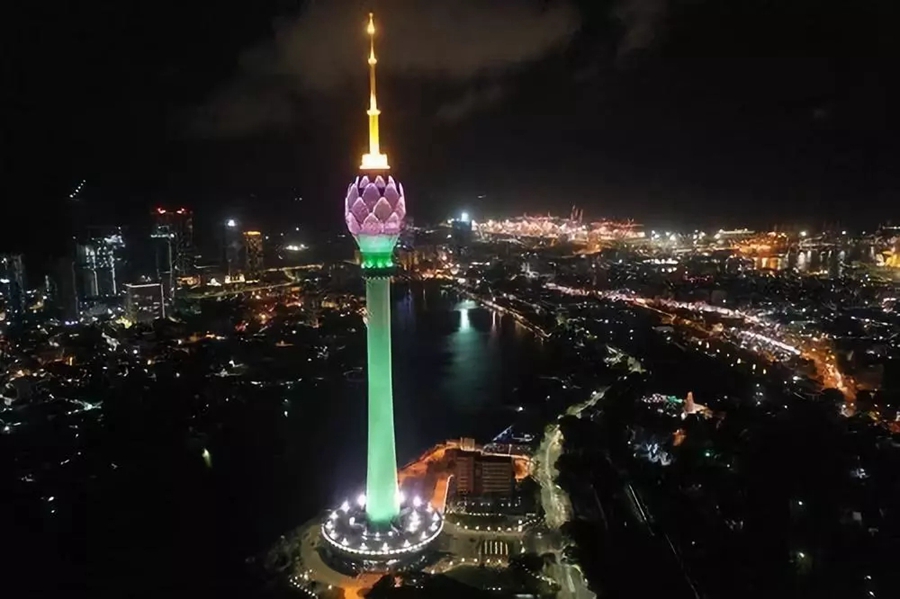 斯里蘭卡首都科倫坡地標(biāo)建筑蓮花電視塔9月16日晚舉行竣工慶典??苽惼律徎娨曀侵兴箖蓢?guó)在“一帶一路”建設(shè)中的重要合作項(xiàng)目。新華社發(fā)