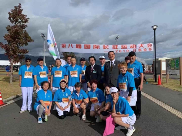 日本長井市市長內(nèi)谷重治、副市長平進介、國際長征運動會創(chuàng)始人杜地以及部分運動員在比賽現(xiàn)場合影。(圖片由國際長征運動會委員會提供)