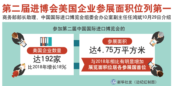 新華社北京10月29日電(記者陳煒偉、于佳欣)商務(wù)部部長(zhǎng)助理、中國(guó)國(guó)際進(jìn)口博覽會(huì)組委會(huì)辦公室副主任任鴻斌29日介紹,參加第二屆中國(guó)國(guó)際進(jìn)口博覽會(huì)的美國(guó)企業(yè)數(shù)量達(dá)192家,比去年增長(zhǎng)18%;參展面積達(dá)4.75萬(wàn)平方米,與去年相比有明顯增加,展覽面積位居各參展國(guó)首位。