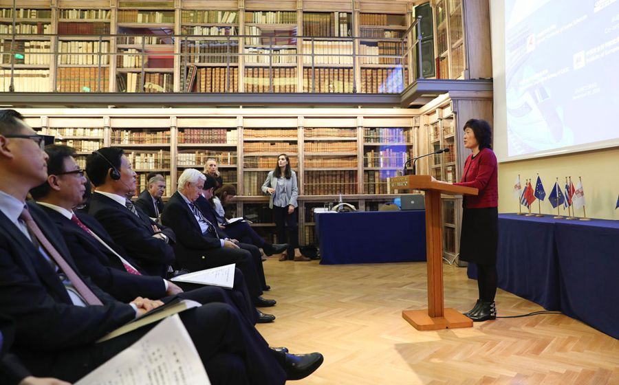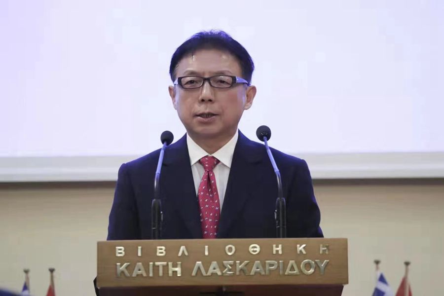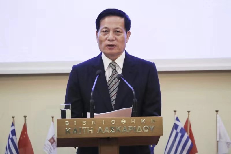 中國(guó)駐希臘大使章啟月在研討會(huì)上致辭。