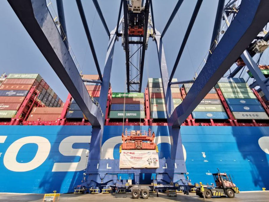 9月6日,在希臘比雷埃夫斯港,裝有進(jìn)博會(huì)參展貨物的冷箱正在裝船。新華社記者李曉鵬攝