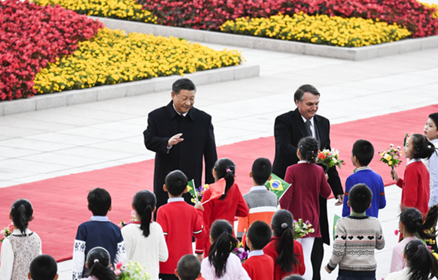 圖為2019年10月25日,習(xí)近平在人民大會堂東門外廣場為到訪的巴西總統(tǒng)博索納羅舉行歡迎儀式。在巴西出席金磚國家領(lǐng)導(dǎo)人會晤期間,習(xí)主席還將同博索納羅總統(tǒng)舉行會談。這將是一個月內(nèi)兩國元首再次互動。新華社記者高潔攝