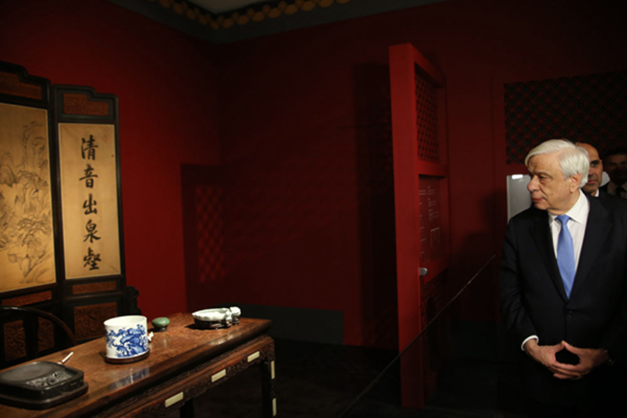 2018年9月14日,在希臘首都雅典衛(wèi)城博物館,希臘總統(tǒng)帕夫洛普洛斯(右)在“重文德之光華:重華宮原狀文物展”上參觀。這是來自中國故宮博物院的154件清朝乾隆時(shí)期珍貴文物首次出國展出。新華社發(fā)(馬里奧斯·羅洛斯攝)