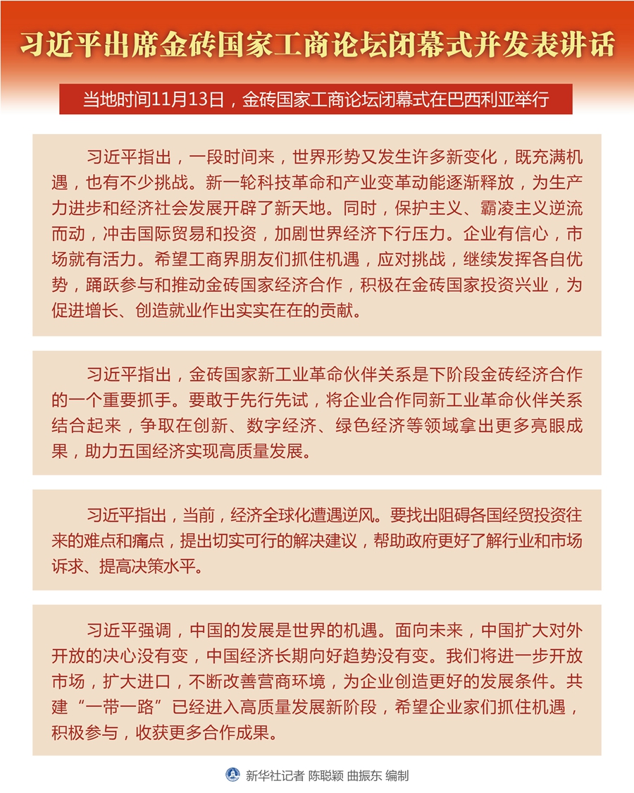 當(dāng)?shù)貢r(shí)間11月13日,金磚國家工商論壇閉幕式在巴西利亞舉行。國家主席習(xí)近平出席并發(fā)表講話。 新華社記者 謝環(huán)馳 攝