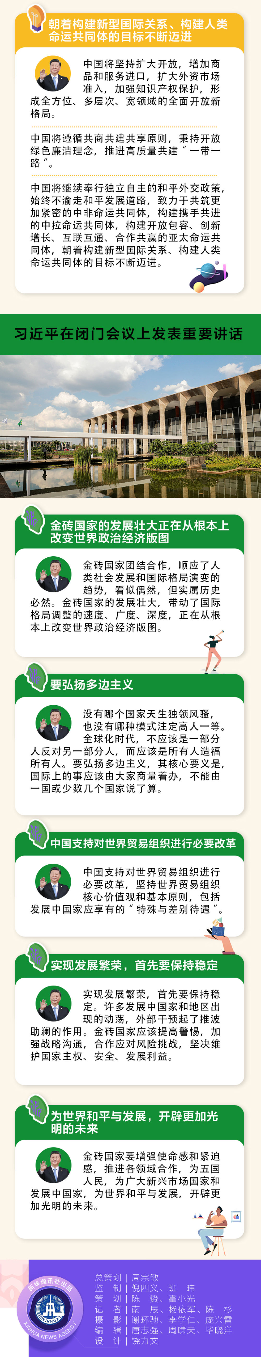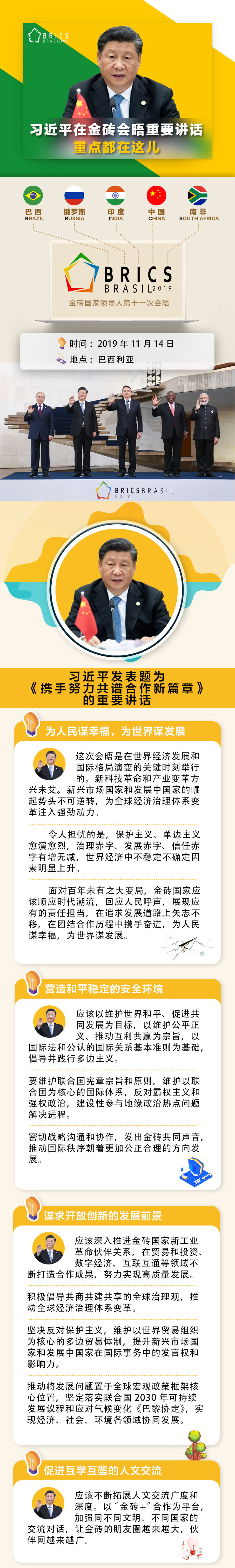 當(dāng)?shù)貢r(shí)間11月14日,金磚國(guó)家領(lǐng)導(dǎo)人第十一次會(huì)晤在巴西首都巴西利亞舉行。巴西總統(tǒng)博索納羅主持會(huì)晤。中國(guó)國(guó)家主席習(xí)近平、俄羅斯總統(tǒng)普京、印度總理莫迪、南非總統(tǒng)拉馬福薩出席。習(xí)近平發(fā)表題為《攜手努力共譜合作新篇章》的重要講話。當(dāng)天,金磚國(guó)家領(lǐng)導(dǎo)人還舉行閉門會(huì)議,習(xí)近平在會(huì)上發(fā)表重要講話。