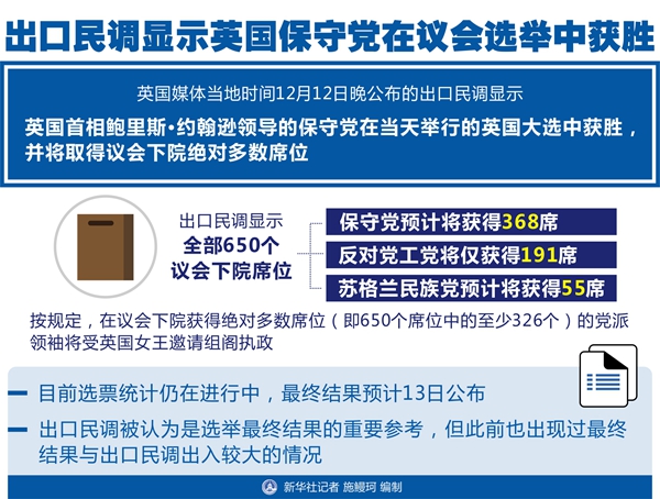 新華社倫敦12月12日電(記者桂濤 張代蕾)英國媒體12日晚公布的出口民調顯示,英國首相鮑里斯·約翰遜領導的保守黨在當天舉行的英國大選中獲勝,并將取得議會下院絕對多數(shù)席位。