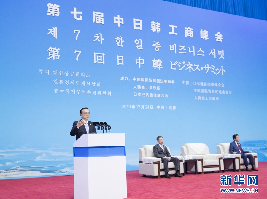 12月24日,國(guó)務(wù)院總理李克強(qiáng)在四川成都與韓國(guó)總統(tǒng)文在寅、日本首相安倍晉三共同出席第七屆中日韓工商峰會(huì)并致辭。 新華社記者 王曄 攝