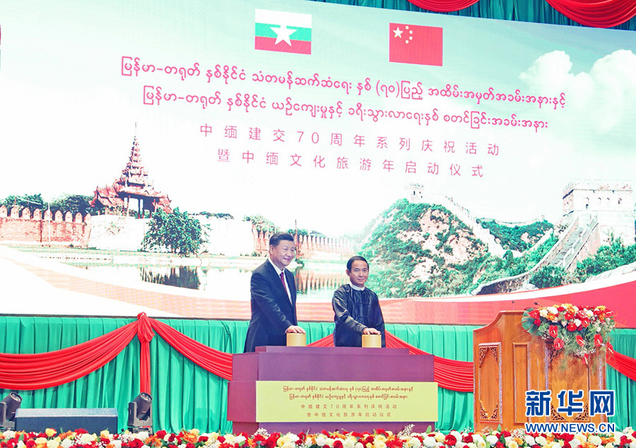 當(dāng)?shù)貢r(shí)間1月17日晚,國家主席習(xí)近平在內(nèi)比都第二國際會(huì)議中心出席中緬建交70周年慶?;顒?dòng)暨中緬文化旅游年啟動(dòng)儀式。這是習(xí)近平和緬甸總統(tǒng)溫敏共同按下按鈕,正式啟動(dòng)中緬文化旅游年。 新華社記者 鞠鵬 攝