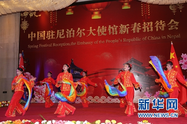 中國(guó)駐尼泊爾大使館2020年新春招待會(huì)開(kāi)場(chǎng)舞蹈《歡天喜地》。記者 唐薇 攝